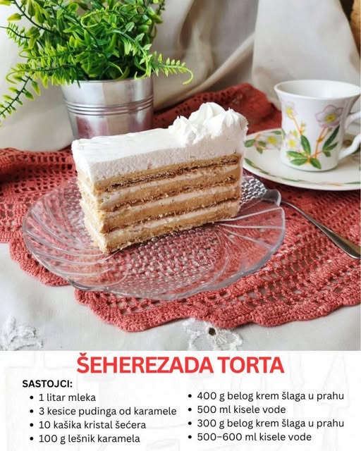 Šeherezada torta je lagana, kremasta i vizuelno dopadljiva, a njena najveća prednost je to što se pravi bez uključivanja rerne. Priprema je jednostavna, ali efekat koji ostavlja je – kraljevski.