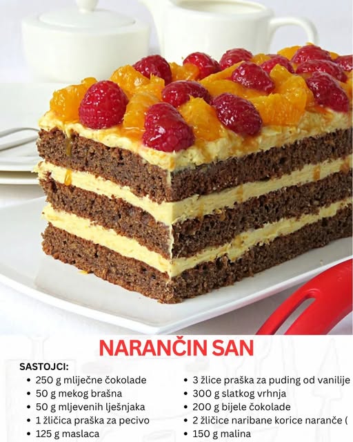 Zamislite bogat, sočan biskvit prepun mliječne čokolade i lješnjaka, prekriven finom kremom od bijele čokolade, začinjenoj koricom naranče, s malinama koje dodaju svježinu i prirodnu kiselost. Ovaj kolač je savršen za svaku priliku – od obiteljskih okupljanja do uživanja uz popodnevnu kafu ili čaj. Kombinacija svih ovih sastojaka čini ovaj desert ne samo vizualno atraktivnim, već i potpuno neodoljivim u okusu. Ako ste ljubitelj slatkih užitaka, ovaj recept ne smije proći nezapaženo!