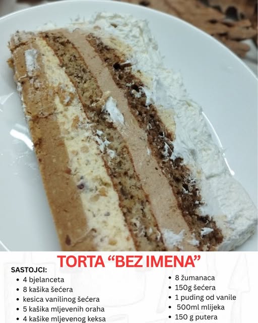Kada tražite recept za tortu koja nije komplikovana, a ipak osvaja svojim slojevima, bogatim ukusima i jedinstvenim sastojcima, torta “Bez imena” je pravi izbor. Ova torta se sastoji od pažljivo pripremljenih korica i kremastih filova sa orasima, čokoladom i plazmom, koji zajedno čine harmoničnu i neodoljivu kombinaciju.