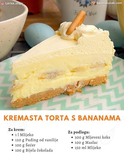 Ako tražite brz i ukusan desert koji ne zahtijeva pećnicu, ova kremasta torta s bananama je pravi izbor! Nježna puding krema s bijelom čokoladom, sloj sočnih banana i podloga od keksa čine savršen spoj okusa kojem je teško odoljeti. Ova torta je često pravi hit na obiteljskim proslavama, rođendanima i nedjeljnim ručkovima jer je jednostavna za pripremu, a izgleda kao iz vitrine najfinije slastičarnice.