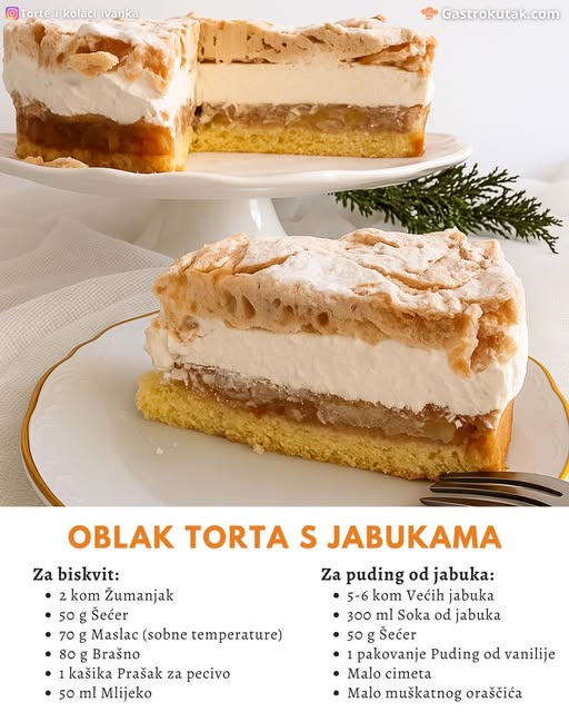 Oblak torta s jabukama je lagan i ukusan desert koji savršeno kombinuje sočan biskvit, aromatični puding od jabuka, bogatu kremu i hrskavu beze koru.