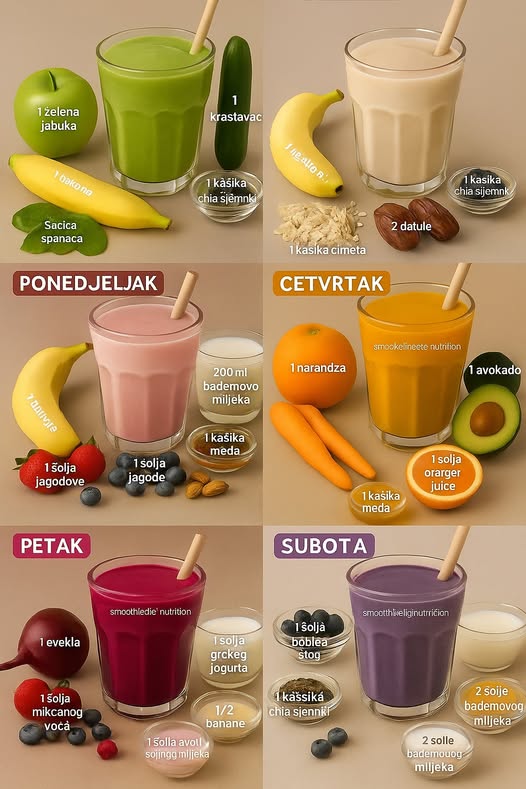Ponedjeljak:1 zelena jabuka, 1 banana, šaka spanaća, 1 krastavac, 1 kašika chia sjemenki. Utorak:1 kašika …