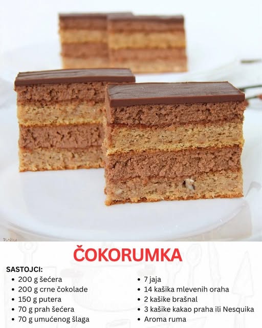 Ova poslastica ne nosi slučajno svoje ime – spoj bogatog čokoladnog ukusa, mirisne arome ruma, orahastih kora i baršunastog fila čini ovu tortu pravim čokoladnim remek-delom. Osmišljena tako da zadovolji i najzahtevnije sladokusce, Čokorumka se ne pravi svaki dan – ali kada se napravi, pamti se.