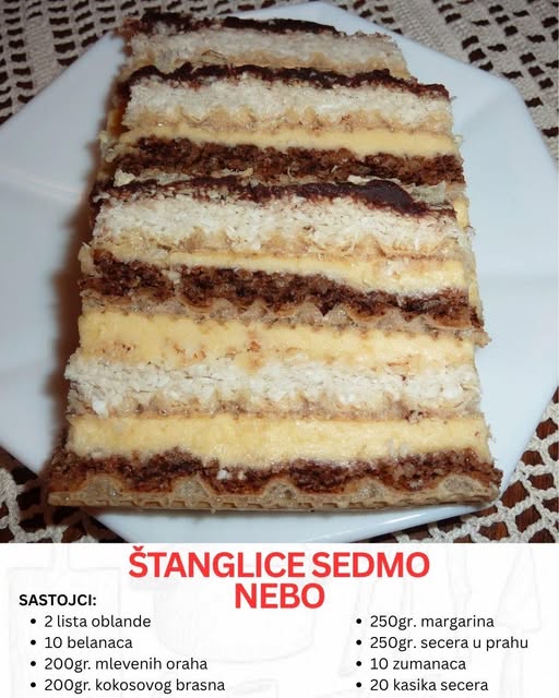 U svetu gurmanskih zalogaja, Stanglice Sedmo nebo predstavljaju vrhunski spoj tekstura i ukusa. Ovo je torta čiji slojevi obećavaju pravu nebofornu slast – hrskave, bogato orašaste, i kremno obojene u slojevima. Naziv „Sedmo nebo“ ne dolazi slučajno – svaki zalogaj vodi vas bliže gastronomskoj ekstazi.