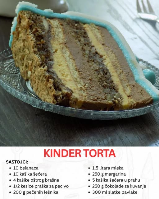 Kada poželite tortu koja spaja bogat ukus, neodoljivu kremastu teksturu i dašak luksuza — Kinder torta je pravi izbor. Ova torta nije samo obična poslastica, već pravi gastronomski užitak koji kombinuje nekoliko slojeva filova, hrskave orašaste kore, nutelu, plazma keks, čokoladu i pregršt pažljivo biranih sastojaka koji je čine posebnom.