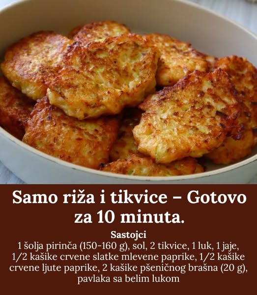 Sastojci: 1 šolja pirinča (150-160 g)sol2 tikvice1 luk1 jaje1/2 kašike crvene slatke mlevene paprike1/2 kašike …