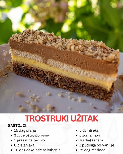 Ako volite deserte koji spajaju više tekstura i bogate slojeve ukusa, Trostruki užitak je baš ono što tražite. Ovaj kolač kombinuje prozračni orahov biskvit, dva tipa kreme – tamnu čokoladnu i svijetlu vanil – te diskretno hrskavi sloj Petit keksa, uz završni posip orahâ. Rezultat je sklad slatkoće, orašastog tona i kremaste punoće, sa prijatnim kontrastom mekanog biskvita i tankog keksa.