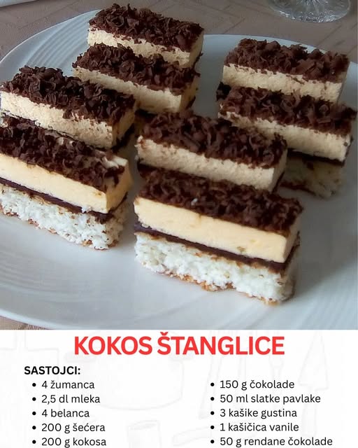 Postoje kolači koji svojom jednostavnošću i skladom ukusa postanu nezaobilazni deo svake trpeze. Jedan od takvih slatkih bisera su upravo kokos štanglice. Ovaj kolač savršeno spaja tri osnovna sloja – prozračan biskvit od belanaca i kokosa, nežnu i kremastu fil masu od žumanaca i mleka, te završni čokoladni preliv koji sve to povezuje u skladnu celinu.
