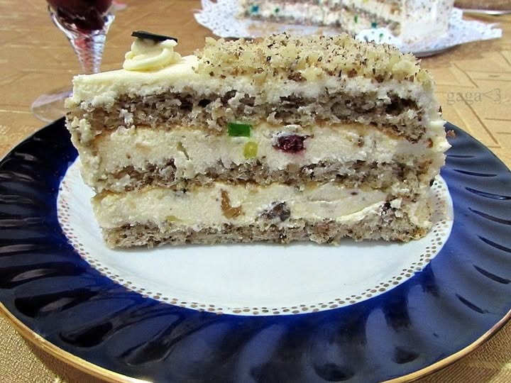 Da nastavim slatko… Ovu tortu sam prvi put jela za moju veridbu, pre okruglo 29 godina. Pravila je moja svekrva i to je bila jedna od retkih torti čiji recept nije “poboljšavala”, iako je volela da u svakoj nešto izmeni i da joj da svoju ličnu notu… I kasnije je za svaku svečaniju priliku pravila baš ovu tortu i svi smo je rado jeli! Iako spada u klasične torte sa orasima, puterom i jajima, nije prejaka jer je bez čokolade, pa se uvek “repetiralo” (kako smo se mi zezali za repete), odnosno tražilo se obavezno još jedno parče…