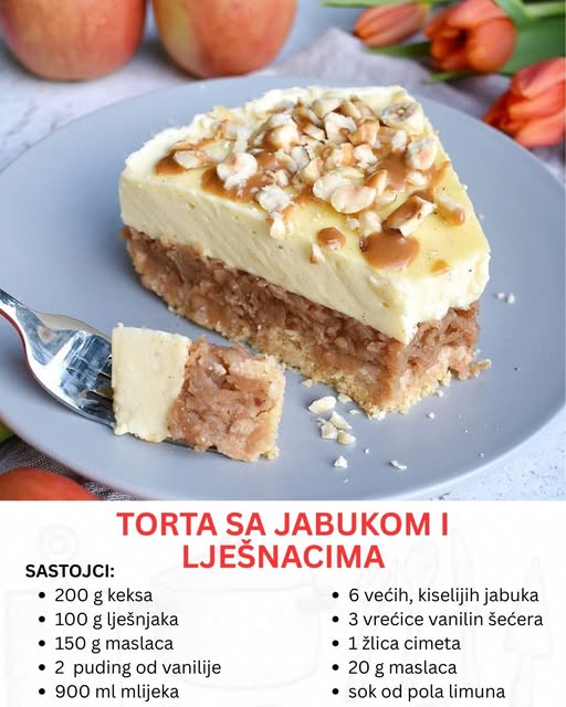 Torta s jabukama je klasik koji spaja sočne jabuke, kremastu vanilin kremu i hrskavu podlogu od keksa i lješnjaka. Ovaj recept ističe se kombinacijom bogatih aroma – cimet, limun, đumbir i vanilija – koje zajedno stvaraju savršenu harmoniju okusa. Svaki zalogaj ove torte pruža kontrast između hrskave podloge, sočnih jabuka i kremastog fila, čineći je idealnom poslasticom za porodična okupljanja, praznične stolove ili posebne prilike.