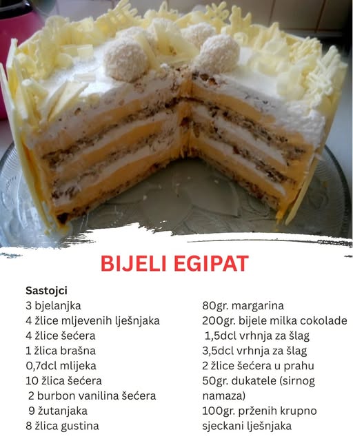 Torta Bijeli Egipat nije samo običan kolač – to je umjetnost koja okuplja bogatstvo okusa i tekstura u svakom sloju. Svaki korak pripreme daje posebno zadovoljstvo, a rezultat će sigurno oduševiti sve koji je probaju. Biskvit je mekan i zračan, kreme su bogate i kremaste, a dekoracija od čokolade i lješnjaka dodaje završnu notu sofisticiranosti.