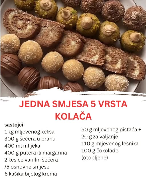 Zamislite da iz jedne jedine, jednostavne smjese možete stvoriti pet potpuno različitih kolača, svaki s jedinstvenim ukusom, izgledom i teksturom. Ovo nije samo kulinarski trik – već prava poslastičarska čarolija koja štedi vrijeme, trud i novac. Upravo takav koncept nudi recept koji počinje s baznom smjesom, a zatim se kroz nekoliko dodataka i varijacija pretvara u pet različitih slastica: pistać gnezda, kokos rolat, kokos kuglice, lešnik gnezda i bajadera kuglice.