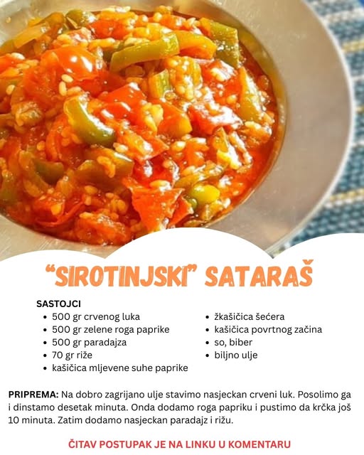 Ovaj recept je pravi primer kako se jednostavni sastojci mogu pretvoriti u ukusan obrok koji će zadovoljiti i najzahtevnije nepce. Sataraš je klasik koji je, uz minimalan trud, moguće napraviti u bilo kojoj kuhinji, a ujedno je i izuzetno prilagodljiv u smislu sastojaka, pa ga možete menjati i prilagođavati prema sezoni i raspoloživim namirnicama. Prijatno!