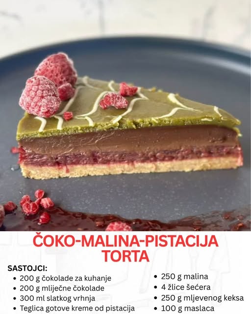 Čoko-Malina-Pistacija torta je spoj kremaste čokolade, osvežavajuće kiselkastih malina i suptilne, orašaste note pistacije — pravi izbor kad želite impresivan, ali ipak jednostavan desert. Ova torta se sastoji iz tri jasno odvojena sloja: hrskava podloga od mljevenog keksa, sočni fil od malina i gusti čokoladni ganache, a sve završava bogatim preljevom od pistacija i dekoracijom od bijele čokolade.