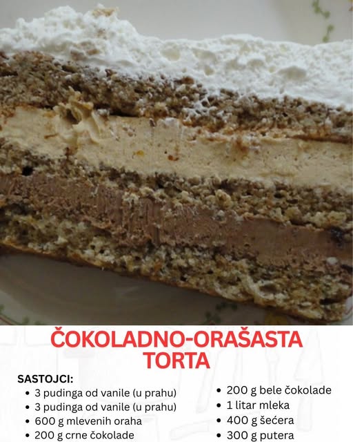 Ova torta spaja lagane i hrskave kore od belanaca i oraha sa bogatim kremama na bazi pudinga, obogaćenim tamnom i belom čokoladom. Radi se o klasičnom, domaćem posluženju koje odiše teksturnim kontrastom: hrskave kore i kremasta unutrašnjost. Ako želite tortu koja ostavlja utisak, a nije previše komplikovana, ovaj recept je odličan izbor.