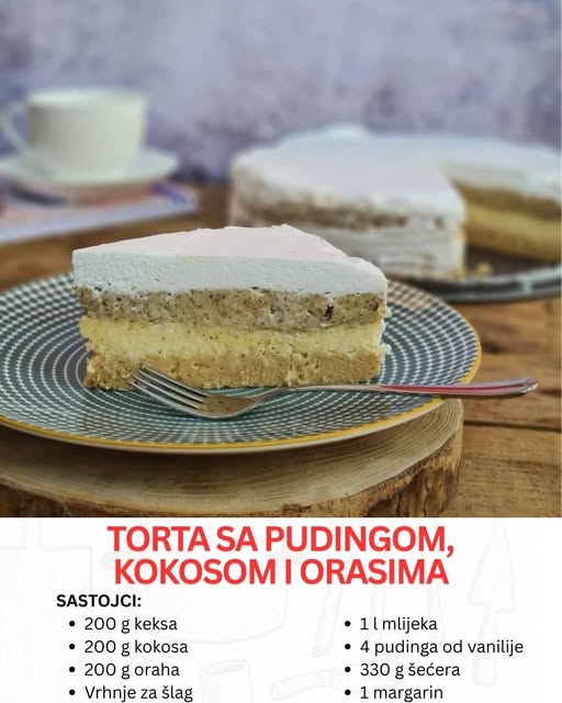 Recept koristi jednostavne sastojke koje većina domaćinstava ima pri ruci — mlijeko, puding od vanilije, šećer, margarin i nekoliko dodataka koji daju svakom sloju svoj karakter: keks, kokos i orasi. Krajnji rezultat je torta koja je vizuelno atraktivna, ukusno slojevita i idealna za posluženje na porodičnim okupljanjima ili kao desert nakon nedeljnog ručka.
