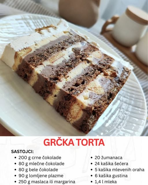 Ako ste ikada želeli da pripremite tortu koja izgleda i miriše poput luksuznog deserta iz poslastičarnice, Grčka torta je savršen izbor. Ova torta kombinuje hrskave i lagane kore sa bogatim, kremastim filom koji spaja više vrsta čokolade i plazmu. Njena struktura slojeva pruža vizuelni dojam sofisticiranog deserta, dok balans ukusa čini svaki zalogaj nezaboravnim.
