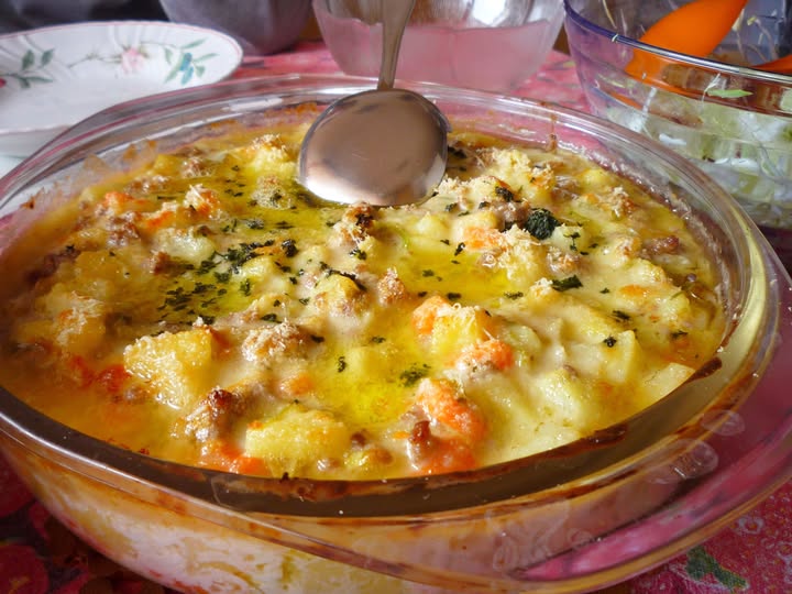 U vatrostalnu posudu ( ili po želji neku drugu koja može u pećnicu) staviti ocijeđene krumpire i mrkvu, dodati meso s porilukom te sve preliti bijelim umakom. Dobro promiješati, na vrh staviti nekoliko komadića maslaca, posipati isjeckanim peršinom i ribanim parmezanom.