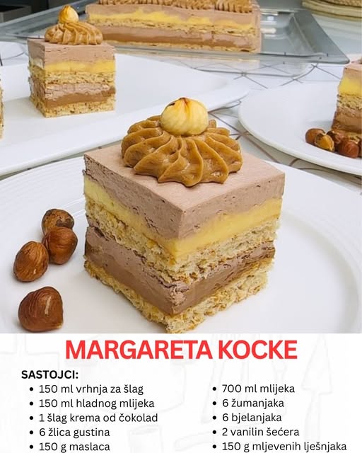Ako volite desert koji u jednom zalogaju spaja vazdušastu koru, orašasti miris i dvije čokoladne note, Margareta kocke su baš to: elegantan kolač koji izgleda profinjeno, reže se uredno na porcije i pri svakom presjeku otkriva lijep kontrast slojeva.
