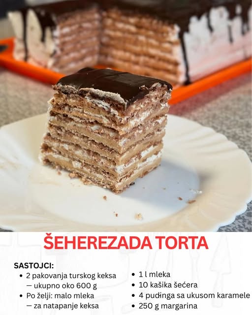 Šeherezada torta je prava poslastica za sve koji vole bogate, kremaste kolače koji se prave brzo i bez pečenja. Ovaj recept kombinuje tanke turske kekse (slične petit beurre, ali s filom), dva sloja čokoladno-karamel kreme i vazdušasti šlag — rezultat je elegantna torta koja osvaja i izgledom i ukusom. Prednost recepta je što je jednostavan za pripremu, a istovremeno daje profesionalan finiš koji će oduševiti porodicu i goste.