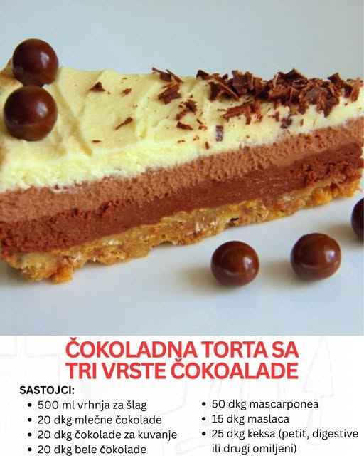 Ako tražite tortu koja u isto vreme izgleda luksuzno i ne zahteva pečenje biskvita, ova čokoladna torta sa tri vrste čokolade pravo je rešenje. Kombinacija hrskave podloge od keksa i tri sloja različitih čokoladnih krema (tamne, mlečne i bele) daje savršen balans tekstura i ukusa. Recept je jednostavan, efektan i idealan za sve prilike — od porodičnog slavlja do večernjeg slatkog iznenađenja.
