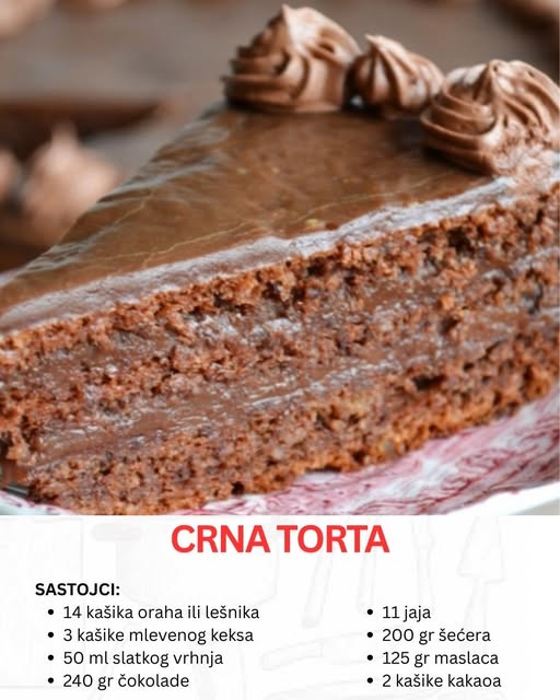 Ako tražite tortu koja će svojom bogatom čokoladnom aromom i kremastim filom očarati svakog ljubitelja slatkiša, Crna torta je upravo ono što vam treba.