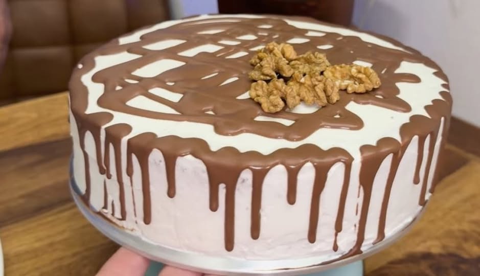 Ređati tamnu koru, pa fil, pa belu koru, pa fil. Ukrasiti rastopljenom čokoladom.