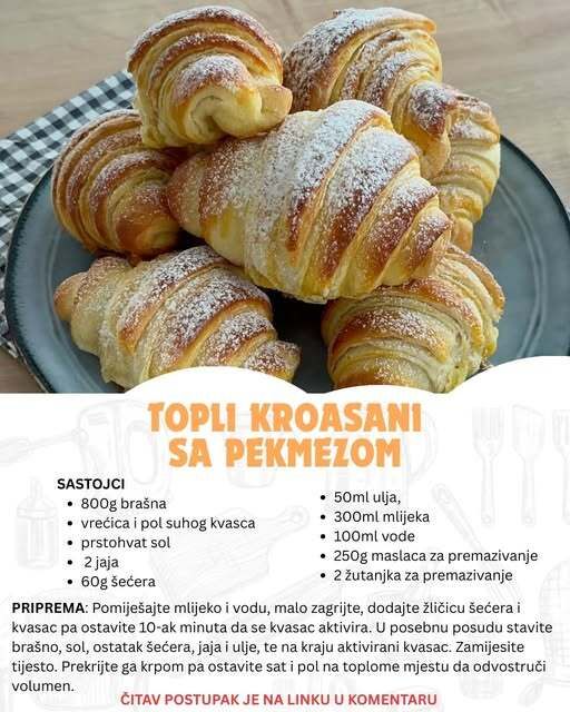 Ovaj recept zahteva vreme, pažnju i posvećenost, ali zauzvrat nudi zlatne, mekane kroasane u kojima se prepliću slatkoća, voćna kiselost i toplina domaće kuhinje. Bilo da ih spremate za porodični doručak, vikend poslasticu ili da iznenadite drage ljude, ovi kroasani će vas naučiti da je sporije ponekad zaista bolje.