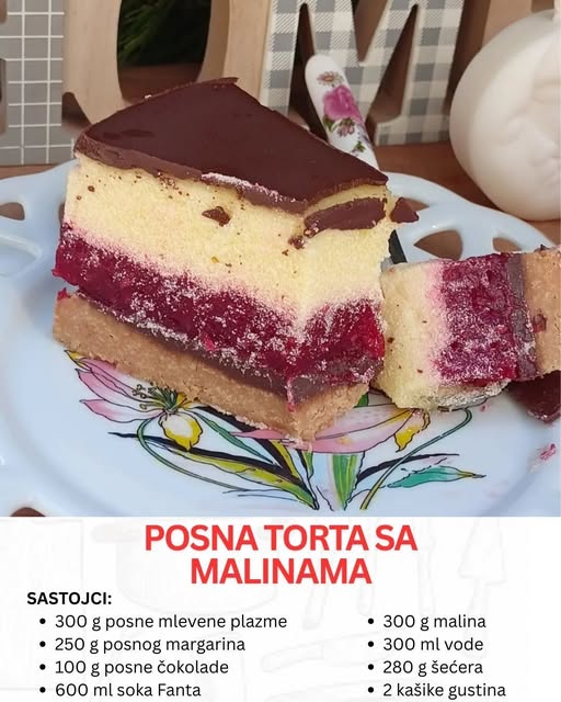 Zamislite tortu koja spaja osvežavajuću voćnu aromu malina, kremastu nežnost vanile i raskošnu završnicu od čokolade. Torta koja je u isto vreme lagana, osvežavajuća i elegantna, a pri tom posna, pa pogodna i za dane posta ili za one koji žele nešto bez mlečnih proizvoda. Upravo takva je posna voćna torta sa malinama.
