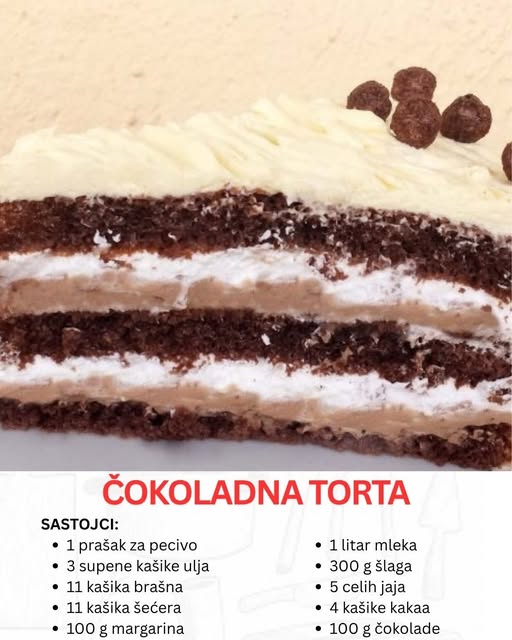U svetu poslastica, čokoladna torta zauzima posebno mesto. Njena bogata tekstura, kombinacija različitih slojeva i neodoljiv miris čokolade čine je omiljenom na proslavama, ali i za svakodnevne trenutke kada želimo da se počastimo nečim slatkim. Ovaj recept kombinuje sočne kore, kremasti čokoladni fil i lagani bijeli sloj šlaga, što rezultira tortom koja je istovremeno elegantna i izuzetno ukusna.
