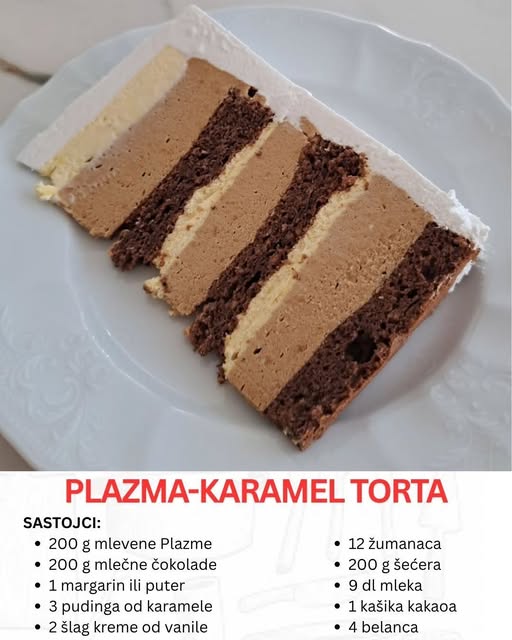 Postoje deserti koji osvajaju na prvi zalogaj, oni koje ne možete zaboraviti čak i nakon što prođe mnogo vremena. Jedan od takvih je Plazma-karamel torta – raskošna, kremasta i savršeno balansirana poslastica u kojoj se spajaju karamel, čokolada i poznati ukus Plazma keksa. Ovaj recept spada u one koje domaćice rado čuvaju u svojim sveskama, jer je dovoljno poseban za svečanosti, a opet dovoljno „topao“ i poznat da budi uspomene na detinjstvo.