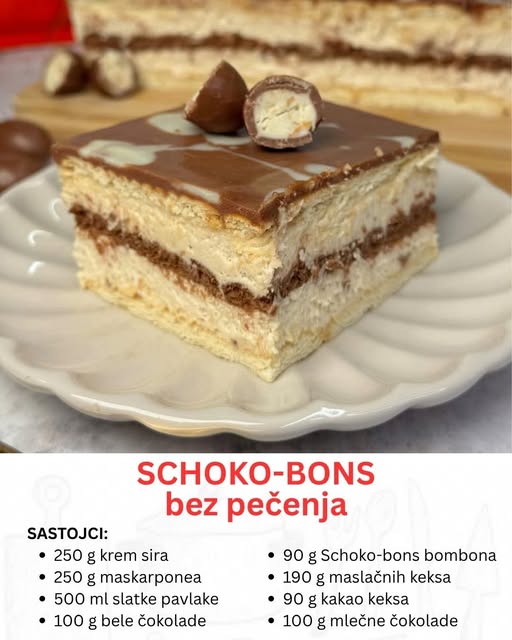 Ovaj desert je posebno zanimljiv jer u sebi kombinuje popularne Schoko-bons bombone, koje mnogi već obožavaju same po sebi, sa laganom kremom i hrskavom podlogom. Rezultat je spoj različitih tekstura i ukusa koji se savršeno dopunjuju.