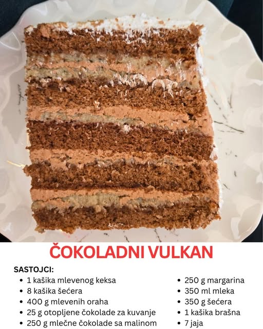 Kada se sve složi, kolač treba da odstoji nekoliko sati, a idealno bi bilo da prenoći u frižideru. Tokom tog vremena, svi ukusi se sjedine i nastane onaj prepoznatljivi „vulkanski efekat“ – slojevi se stapaju, čokolada postaje kremasta, a orasi daju onu zemljanu notu koja savršeno uravnotežuje slatkoću.
