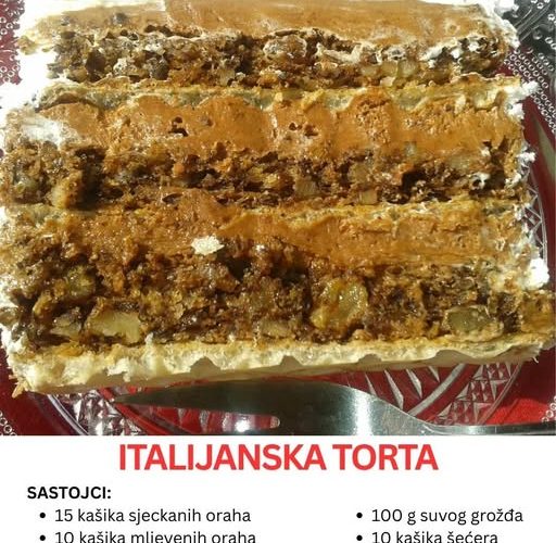 U svetu poslastica, retko koji kolač uspe da ujedini bogat okus orašastih plodova, čokolade i sočnu, slojevitu teksturu u savršenom skladu. Upravo takva je ova receptura za Italijansku tortu, koja svojim slojevima, kremom i dekoracijom podseća na prave delicije iz vrhunskih slastičarnica.  Ovaj recept kombinuje mekanu koru sa orasima i keksom, bogat čokoladni krem i fini šlag, stvarajući slojeve koji se savršeno slažu i daju torti impresivan izgled i još bolji ukus.