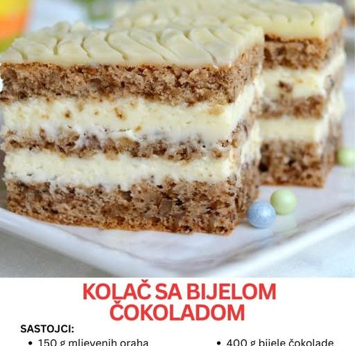 Neki kolači deluju jednostavno, ali kriju u sebi sofisticiranu ravnotežu ukusa koja osvaja već pri prvom zalogaju. Ovaj kolač s bijelom čokoladom upravo je takav: kombinacija hrskave, orašaste osnove, svilenkastog krema i blistave glazure koja mu daje onaj završni, profesionalni izgled.