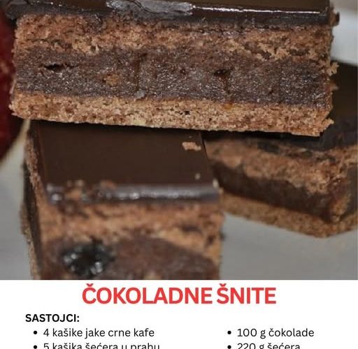 Postoji nešto posebno u kolačima koji nas vraćaju u detinjstvo – u mirise doma, u tople mirisne kuhinje i trenutke kada su porodične večeri bile posebne i nezaboravne. Jedan od tikvih kolača su svakako fine čokoladne šnite, desert koji spaja bogatstvo čokolade, nežnost domaćih sastojaka i mekanu teksturu koja se topi u ustima. Ovaj recept savršeno kombinuje hrskave i mekane slojeve, aromatične dodatke i bogatu glazuru, stvarajući kolač koji osvaja i vizuelno i ukusom.