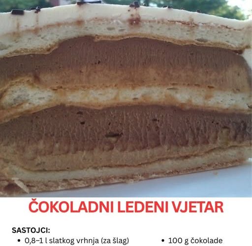 Postoji onaj jedan kolač koji, kada se pojavi na stolu, izazove uzdah divljenja, tišinu i trenutak potpunog uživanja već pri prvom zalogaju. To je čokoladni ledeni vjetar – desert koji spaja laganu pjenastu koru od bjelanaca, svilenkastu kremu od vanilije i čokolade te oblačni šlag koji sve zaokružuje u savršen sklad ukusa i teksture.