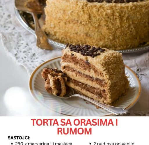 Postoje torte koje osvoje na prvi zalogaj, ali ima i onih koje osvoje na prvi pogled i miris – upravo takva je torta sa orasima i rumom. Ovaj desert je prava poslastica za sve one koji vole bogatstvo ukusa, kombinaciju oraha, ruma i čokolade, i onu neponovljivu aromu domaćih kolača kakve su pravile naše bake.