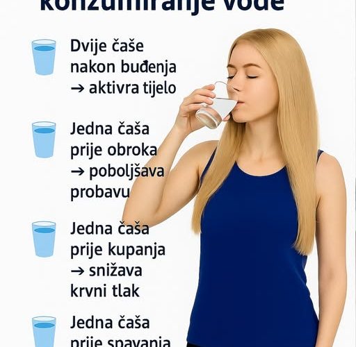 Dvije čaše nakon buđenja → pomažu da se telo probudi, aktiviraju metabolizam i nadoknade tečnosti izgubljene tokom noći.