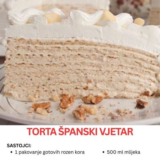 Postoji nešto gotovo poetski elegantno u svakoj domaćoj torti koja spaja jednostavnost pripreme i raskoš ukusa. Jedna od takvih slastica je i torta Španski vjetar sa rozen korama – spoj tradicije, kremaste strukture i lagane hrskavosti koji budi uspomene na porodična okupljanja i svečane trpeze.