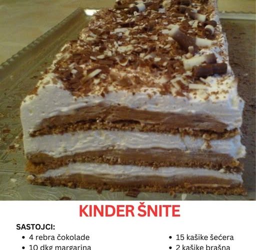 Postoje kolači koji su jednostavno više od slatkiša — oni su uspomena, miris detinjstva, i osećaj doma u svakom zalogaju. Kinder šnite su upravo takve. Ovaj savršeno kremasti kolač nosi u sebi duh klasičnih poslastica koje su nekada krasile svaku porodičnu trpezu. Spoj mekih, čokoladnih kora, bogate kreme od pudinga i čokolade, te laganog šlaga koji sve obavija u neodoljivu mekoću, čini ga desertom kojem je teško odoleti.