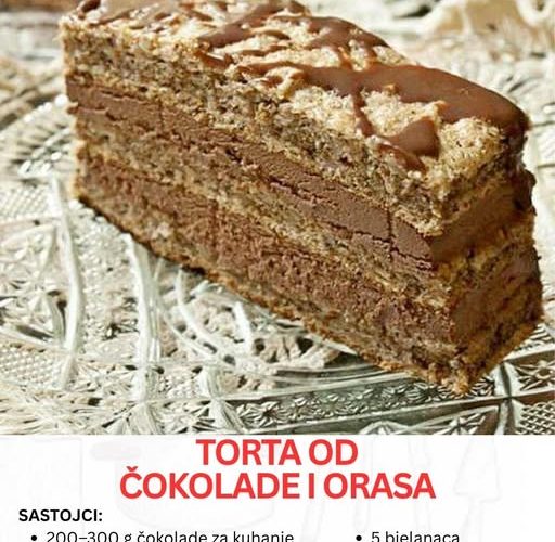 Ako tražite klasičan, bogat i raskošan kolač koji spaja vazdušaste biskvitne kore sa intenzivnim čokoladnim filom i hrskavim orahom, ova torta sa čokoladom i orasima je upravo ono što vam treba. Recept koji ćete pročitati u nastavku zadržava osnovnu logiku originala — tri lagane kore napravljene od belanaca i oraha, te krem zasnovan na žumancima i tamnoj čokoladi.