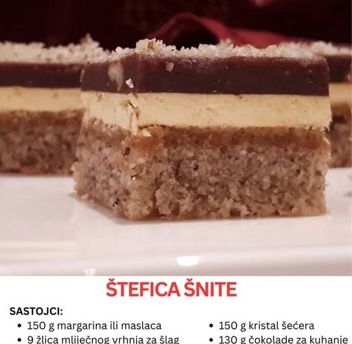Među brojnim kolačima koji su pronašli svoje mjesto u domaćim kuharicama, Štefica šnite zasluženo nose naziv “kraljice štangle”. Ovaj desert, koji se često priprema za blagdane, svečanosti ili nedjeljna obiteljska okupljanja, simbol je elegancije, tradicije i finog domaćeg okusa.