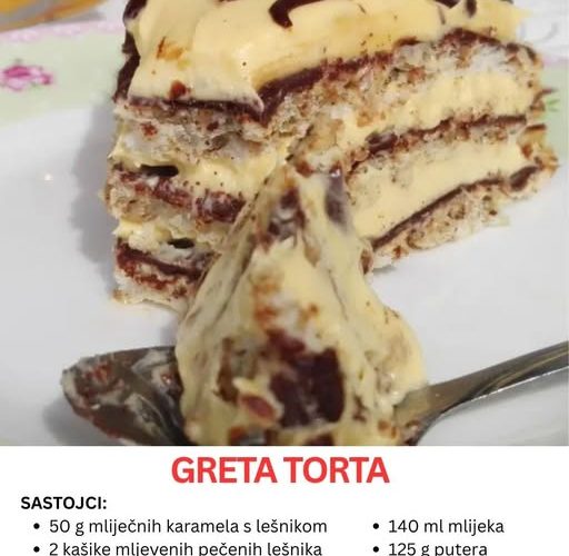 Postoje kolači koji nas vraćaju u djetinjstvo, i oni koji nas osvajaju svojom sofisticiranošću. Greta torta sa lešnicima i karamelom spaja upravo ta dva svijeta – nostalgiju i eleganciju. Ova torta odiše mirisom pečenih lešnika, zavodljivom karamel aromom i bogatim čokoladnim slojevima, stvarajući desert koji osvaja i pogled i nepce.