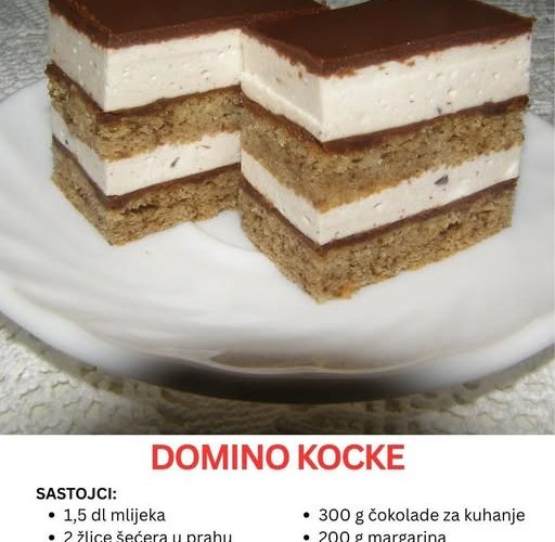 Postoje kolači koji osvajaju na prvi pogled, a još više na prvi zalogaj. Jedan od njih svakako su Domino kocke — savršena kombinacija mekanog biskvita, svilenkaste kreme i čokoladne glazure koja stvara skladan balans između slatkoće i svježine. Ovaj desert svojom elegancijom i jednostavnošću podsjeća na male slastičarske dragulje koji se mogu naći u najboljim poslastičarnicama. Ipak, njegova ljepota leži u činjenici da ga svatko može napraviti kod kuće uz malo truda i puno ljubavi.