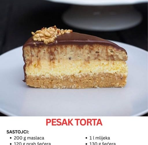 Pesak torta je jedna od onih domaćih poslastica koja osvaja teksturom i jednostavnošću — naziv joj dolazi od blago zrnatog, pješčanog osjećaja fila u ustima, koji podseća na fino mljeveni pijesak. Ovaj desert spaja tri različita okusa i teksture u jednom sloju: plazma, kokos i orašasti sloj, sve povezano kremastim pudingom i bogato obloženo sjajnim ganašom. Iako na prvi pogled recept djeluje jednostavno, u pripremi postoje male tehnike koje prave veliku razliku u konačnom rezultatu.