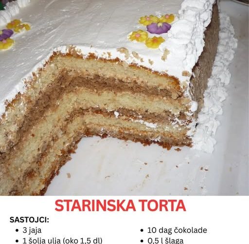 Na trpezama naših baka i majki često su se nalazile klasične domaće poslastice, a među njima posebno mjesto zauzima starinska torta — jednostavna, ali izuzetno bogata okusom. Riječ je o desertu koji podsjeća na neka toplija vremena: miris nedjeljnih ručkova, porodična okupljanja, dječija nestrpljivost oko stola dok se poslužuje prvi komad torte.