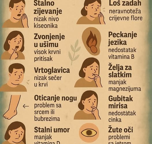 Tijelo uvijek govori — samo ga treba pažljivo slušati. Ovi znakovi ne znače uvijek ozbiljan problem, ali ukazuju da organizmu nešto nedostaje ili da treba dodatnu brigu. Ako se simptomi ponavljaju, najbolje je potražiti savjet ljekara.