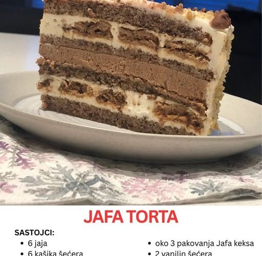 Među brojnim tradicionalnim tortama koje se pripremaju u našim krajevima, posebno mjesto zauzima čuvena Jafa torta – slastica koja već na prvi pogled podsjeća na popularni keks po kojem je dobila ime. Njena prepoznatljiva kombinacija sočnih kora sa orasima, bogatih filova i karakterističnog spoja čokolade i naranče čini je omiljenom na slavljima, rođendanima i porodičnim ručkovima. Zahvaljujući bogatoj teksturi i upečatljivom mirisu, ova torta nerijetko postaje glavni desert na trpezi.