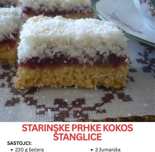 Postoji nešto posebno u starinskim kolačima – u onim receptima koji se prenose s generacije na generaciju, uvijek jednako ukusni i uvijek povezani s toplim uspomenama. Upravo takva poslastica su i starinske prhke kokos štanglice, desert koji se decenijama peče u mnogim domaćinstvima. Ovi nježni, aromatični i lagano hrskavi kolači savršena su kombinacija prhkog tijesta, mirisne marmelade i prozračnog kokos nadjeva